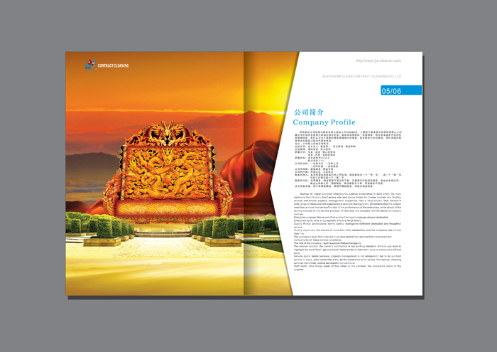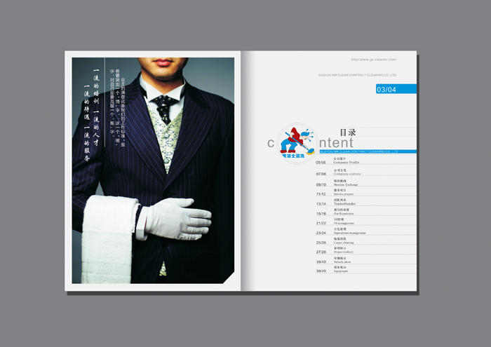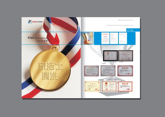 客戶名稱:蘇州家潔士清洗畫冊 行業(yè)類別:家政、保潔 項目分類:畫冊設(shè)計|企業(yè)畫冊設(shè)計|產(chǎn)品畫冊設(shè)計|宣傳冊設(shè)計 項目介紹: 本公司從事地毯、大理石晶面處理、各種材質(zhì)地坪清洗、上蠟拋光、大理石、花崗石翻新、地坪清洗、中央空調(diào)清洗,建筑物外墻清洗及各類清洗,并為工廠賓館、酒樓大型商場、寫字樓及高級公寓提供全年日常保潔及清洗工程管理,裝修后的全面清潔開荒工程,還愉快地和工業(yè)園區(qū)及新區(qū)外資企業(yè)建立了良好的合作關(guān)系,并經(jīng)銷國內(nèi)外知名品牌清洗設(shè)備及化學藥品。本公司擁有各類進口專業(yè)清洗設(shè)備及一批經(jīng)過嚴格培訓具有賓館保潔經(jīng)驗的高素質(zhì)員工,多年從事PA管理經(jīng)驗的現(xiàn)場管理人員,對各類保潔具有獨到的處理方法。
