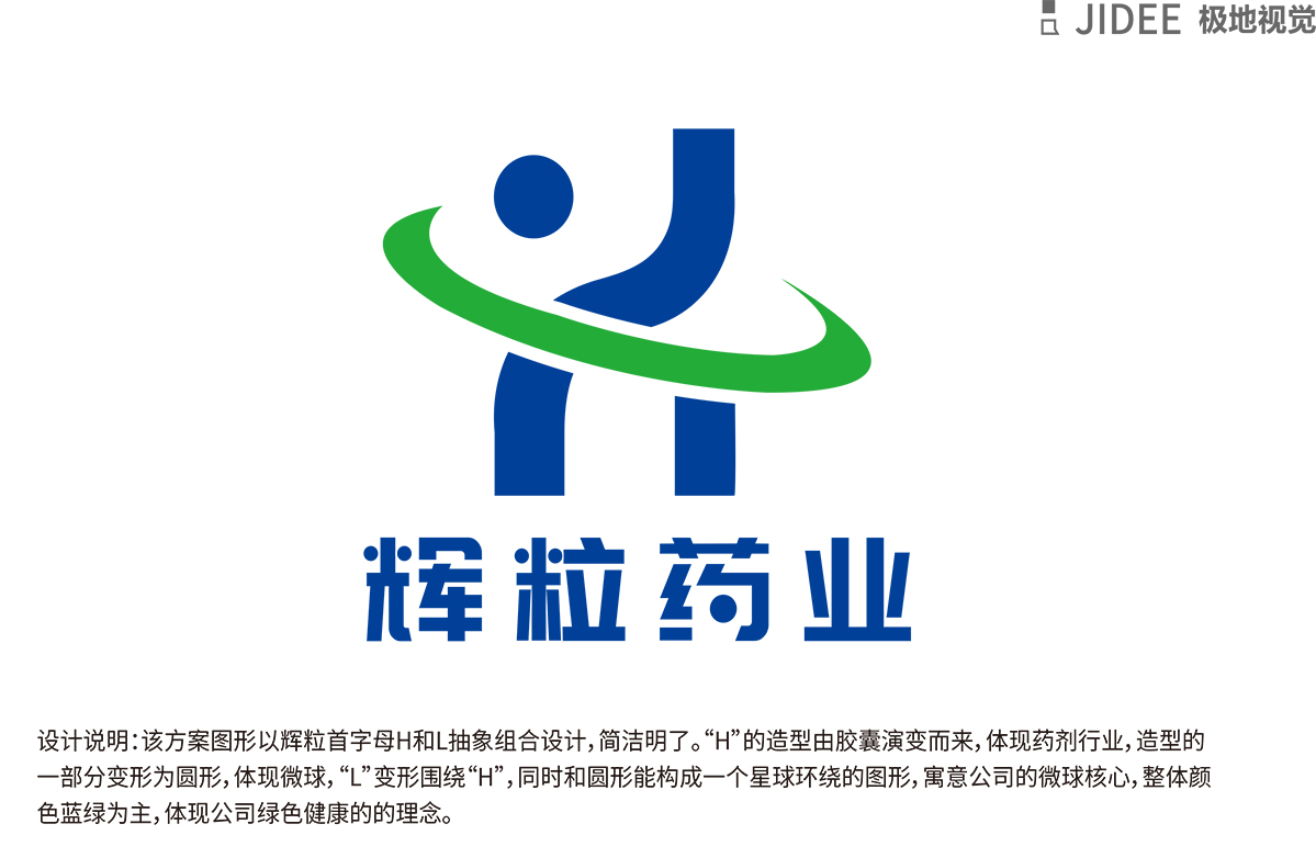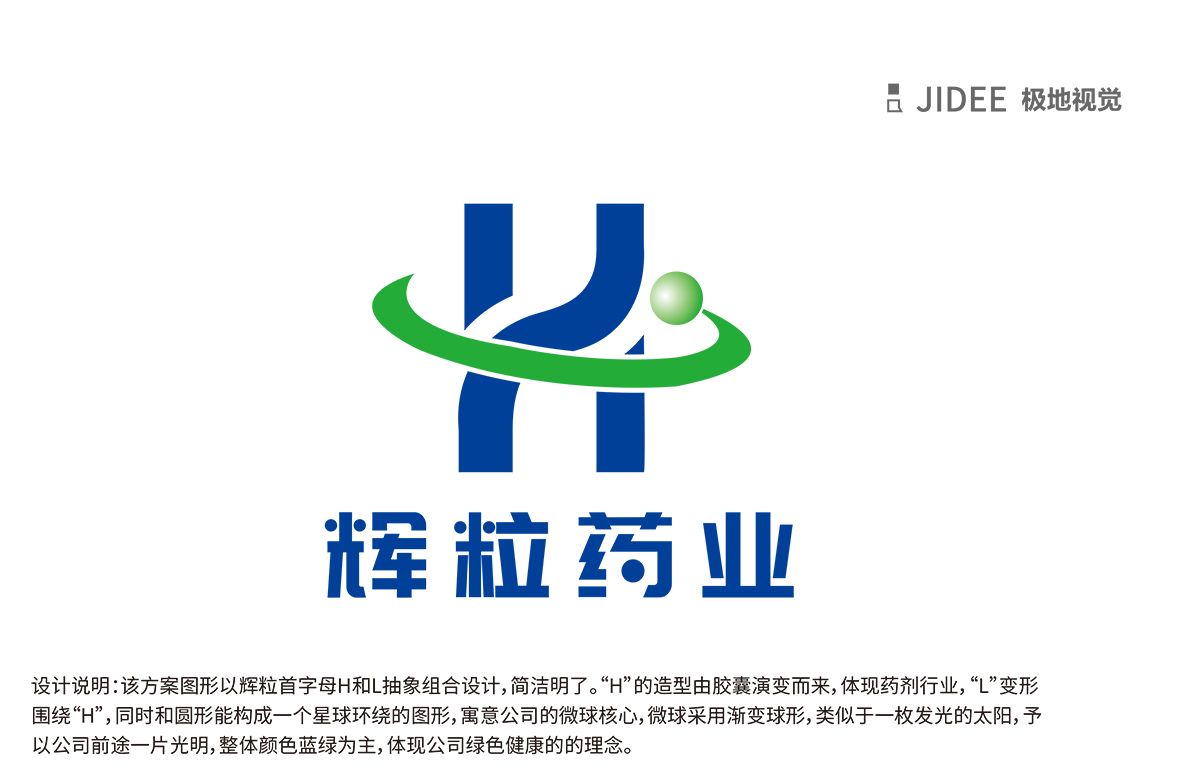 輝粒藥業logo 設計方案以輝粒首字母H和L抽象組合設計,簡潔名了,H 的造型由膠囊演變而成,體現藥劑行業,造型的的一部分變形為圓形,體現微球,L變形圍繞H,同時和圓形能構成一個星球環繞的圖形,寓意公司的微球核心,整體顏色以藍綠為主,體現公司綠色健康的理念。