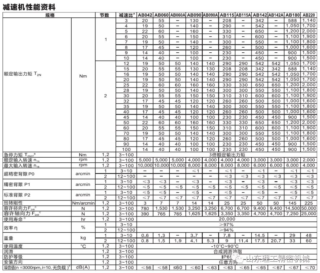 例如上圖的樣本中,減速機(jī)的型號為:AB042-單節(jié),我們在選擇的時候,需要注意幾個地方,第一就是看減速機(jī)的外形,例如上式中的042,其實(shí)外形尺寸為42*42mm,這個時候注意去和你的伺服電機(jī)的外形做比較,通常我們選擇外形相當(dāng)?shù)臏p速機(jī)就可以了。