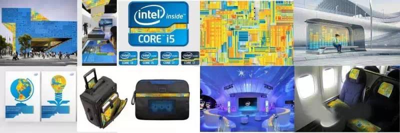 英特爾(intel)品牌設計了一個類似于“芯片”內部結構的輔助圖案,并以金黃色作為主色調。該圖案與品牌標準色“英特爾藍”配合協同運用,相互映襯,出現在建筑物外部和內部空間、各種品牌廣告、品牌制作物以及品牌ICON(圖標)中,具有極其鮮明的獨特識別性,為該品牌注入了無盡活力。這個輔助圖案也作為芯片產品的一種“存在”象征,在放大品牌形象的同時,通過在各種品牌接觸點的廣告運用,也營造了無所不在、無所不能的品牌聯想。