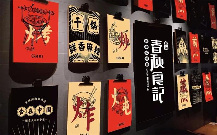 這家主打湘菜美食的新中式快餐店以紅與黑作為主色調,LOGO設計上采用筆畫再設計的現代字體以突顯這家中式快餐的“新”形式。輔助圖形在輔助色的基礎上將多款宣傳語與廣告語呈現出來,并采用手繪插畫的表現手法分別描繪了烤炒煎炸燉蒸煮七種烹調方式,完整地呈現出中國人傳統的飲食習慣與品牌調性相切合。海報的設計上以湖南長沙當地的元素為主題,搭配一些走心趣味的文案,展現出一種新型的快餐方式,以這些輔助插畫為主要形式延伸出一系列的物料設計。室內的設計也秉承著中式的風格,以原木料的材質為主,寬敞明亮的空間,每個區域都被劃分得一目了然。