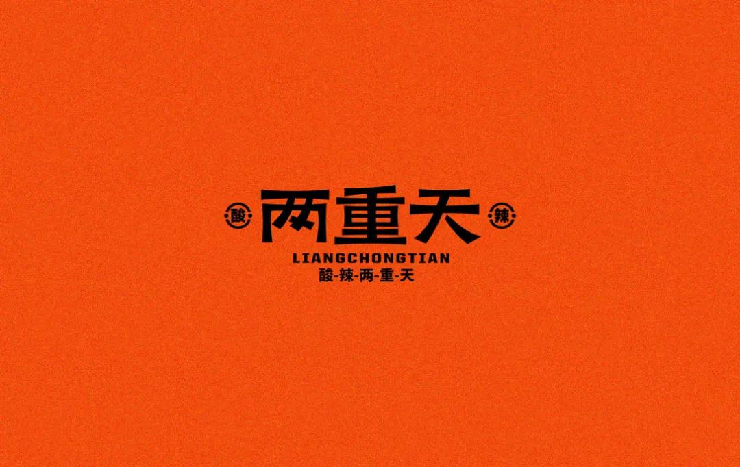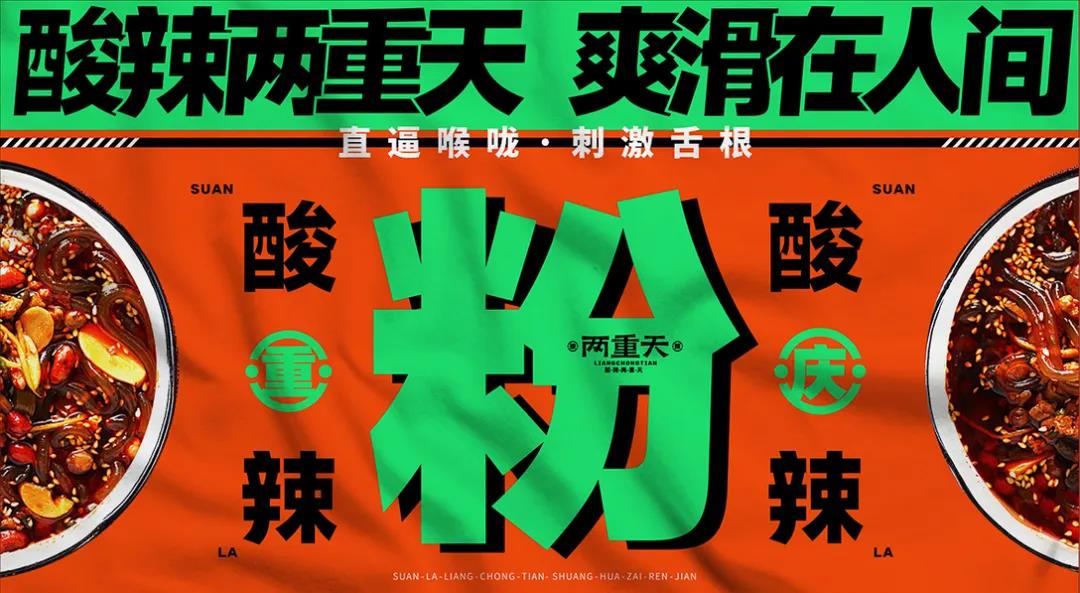 這個酸辣粉的品牌LOGO,是簡潔的幾個字體組成,用排版順序的重次增加視覺效果。而Slogan“酸辣兩重天,爽滑在人間”,表層字眼的文案,有著“簡單粗暴”的勁爽。