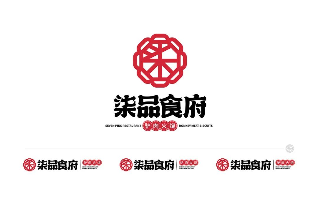 驢肉火燒是華北地區極為流行的傳統小吃,華北地區的大街小巷隨處可見驢肉火燒的店鋪,驢肉也蘊含著極高的營養價值。柒品食府的LOGO圖形提取了花窗的元素,結合名稱的首字“柒”抽象而成,是比較古典的感覺,注重打造品牌的符號文化。而文字的筆劃結束處的上揚或下鉤,令字形呈現出比較輕俏的感覺,圖形與文字,更像是傳統與現代的撞擊。LOGO有著不同的組合樣式,橫版組合樣式重在突出符號和名稱,而豎版組合樣式則側重展現名稱和品類,圖形符號作為點綴,使LOGO的整體呈現更加和諧。