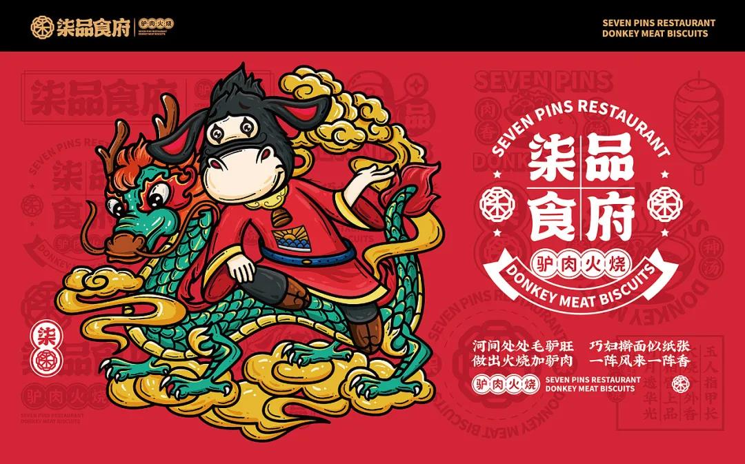 品牌根據品類塑造了一個驢IP,擬人化處理后的驢IP,形態更接近Q版,兩只驢耳朵向外伸展,隨著表情動作向上或向下伸展,很是靈動。傳統服飾在身,對驢肉火燒的歷史悠久進行不經意的刻畫。驢IP拿著不同的東西做出不同的動作時,形象就變得年輕起來了,十分有趣。驢IP與青龍、鯉魚、嫩豬以及小雞等具有中式代表性的動物進行搭配,創作出一幅幅國潮風插畫,是對美好寓意的向往和憧憬,也突出品牌的包容性和多樣性特點。品牌的輔助圖形就比較常見了,從標志和IP中延展,與文案和簡筆食材、菜品結合,以此更好的宣傳柒品食府這個品牌。