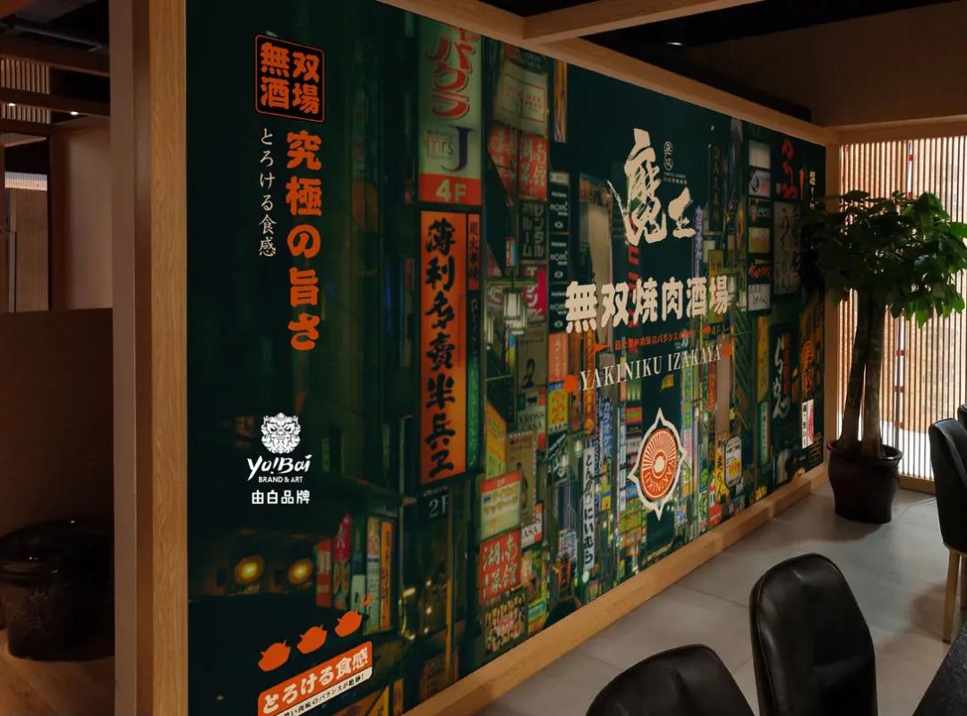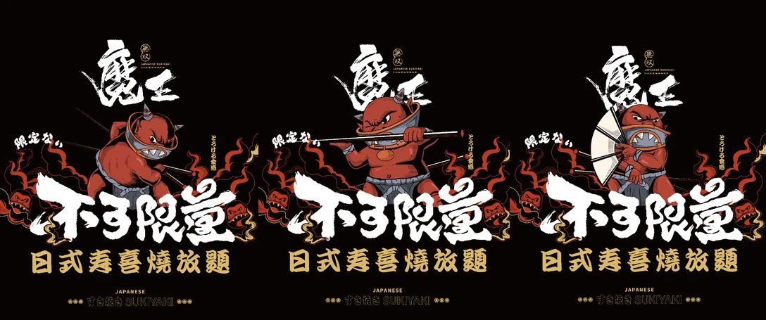 這個(gè)叫魔王無(wú)雙的日料品牌,進(jìn)行了品牌升級(jí),這次的升級(jí)部分是VI和空間,VI部分主要是圍繞IP插畫展開。因?yàn)槠放泼心鯚o(wú)雙,所以在打造符合品牌名的IP時(shí),就塑造了魔王這一個(gè)IP形象,一提起魔王,大家就會(huì)率先想到牛魔王,所以IP形象實(shí)際上是借用了牛魔王這一眾多周知的經(jīng)典形象。通體棕紅的魔王身著日本相撲出場(chǎng)時(shí)所穿的兜擋布,日料的氣息一下子就出來(lái)了。只不過(guò)魔王身上的是鎧甲兜擋布,和面具和牛角一致,面具上所畫的表情有點(diǎn)齜牙咧嘴,看起來(lái)不好惹的樣子,魔王的眉眼皺在一起,眼神堅(jiān)定,加上手里拿著武器,很像要挑戰(zhàn)別人,還堅(jiān)信自己會(huì)贏的武士。但魔王又是日料廚師,做著烤肉加料理的動(dòng)作,兇颯的表情也變得憨了起來(lái)。而由于是日料品牌,品牌設(shè)計(jì)上也采用了很多日本的元素。如浮世繪風(fēng)格的海浪,超大顏色鮮明的字帖、漫畫版式宣傳畫報(bào)等等。整體搭配很有日式漫畫的特點(diǎn),IP形象搭配不同的食材做出不同的表情動(dòng)作,非常豐滿立體,這樣的宣傳畫報(bào)也能在第一瞬間吸引人的注意,從而為門店帶來(lái)更多的消費(fèi)者。海報(bào)設(shè)計(jì)采取左右分布法則,左邊為字體部分,右邊為插畫部分。字體部分橫版分布,通過(guò)加粗突出品牌的經(jīng)營(yíng)優(yōu)勢(shì),插畫部分是一只被拆解的魚,又通過(guò)魔王、海浪、火山等元素形成一只不那么貼緊的魚,趣味性不足。