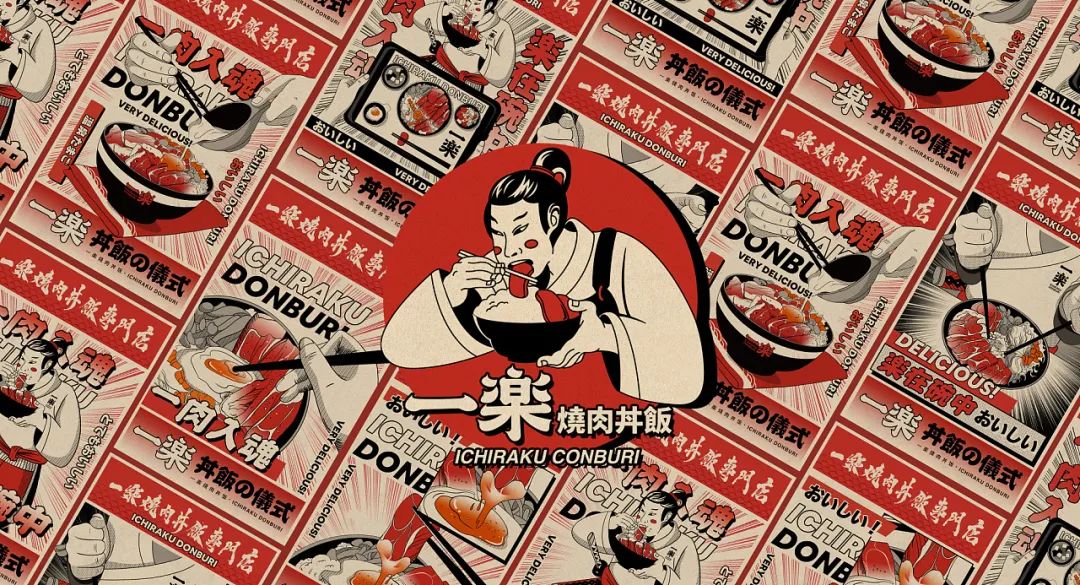 這個(gè)日料的品牌風(fēng)格與大眾小清新不同,參考了日本街道文化熱鬧的沖擊。插畫的靈感是來(lái)自于吃燒肉丼飯時(shí)的步驟,背景是放射線線條來(lái)創(chuàng)造炸裂的效果。顏色上的漸變,有著很強(qiáng)的節(jié)奏感,兩者搭配,就是這種日式熱血復(fù)古設(shè)計(jì)。強(qiáng)烈的顏色反差,具有力量感的字體,給年輕消費(fèi)者營(yíng)造出元?dú)鉂M滿、熱血的氛圍,每一個(gè)細(xì)節(jié)綜合起來(lái)達(dá)到最大化效果。許多的日本料理餐廳,都喜歡原木的和風(fēng)設(shè)計(jì),更能抓住地道的日式風(fēng)格,但這家日料的品牌VI設(shè)計(jì),卻看中了日本街道文化,參照街道繁雜熱鬧時(shí)對(duì)人的沖擊心理,將動(dòng)漫中熱血的氣氛,用反差色的對(duì)比、炸裂的畫感來(lái)表現(xiàn),給餐廳增添不一樣的用餐體驗(yàn)。相信不少的人都看過(guò)日本動(dòng)漫,劇情的設(shè)定、畫面的設(shè)計(jì)都是非常熱血沸騰,讓人看了有種心潮澎湃的感覺(jué),這點(diǎn)可以進(jìn)行參考,以中國(guó)的人物角色為主,同樣可以設(shè)計(jì)出這種風(fēng)格。