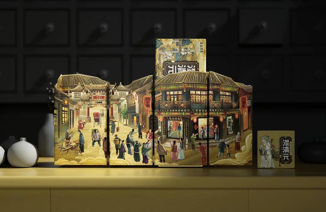 外盒包裝以藥都里仁街為背景,提煉里仁街、中醫館及華佗等的代表元素,構建一個傳統中醫館的形象,特定場景的畫面布局體現了華佗的養生茶工藝,進一步塑造產品關聯性。同時為了區分養生茶品類,外觀采用三種清雅古韻的性質用色,結合立體感十足的插畫,將元素融合成獨特的有文化承載的視覺符號,打造一款差異化的養生茶產品形象。