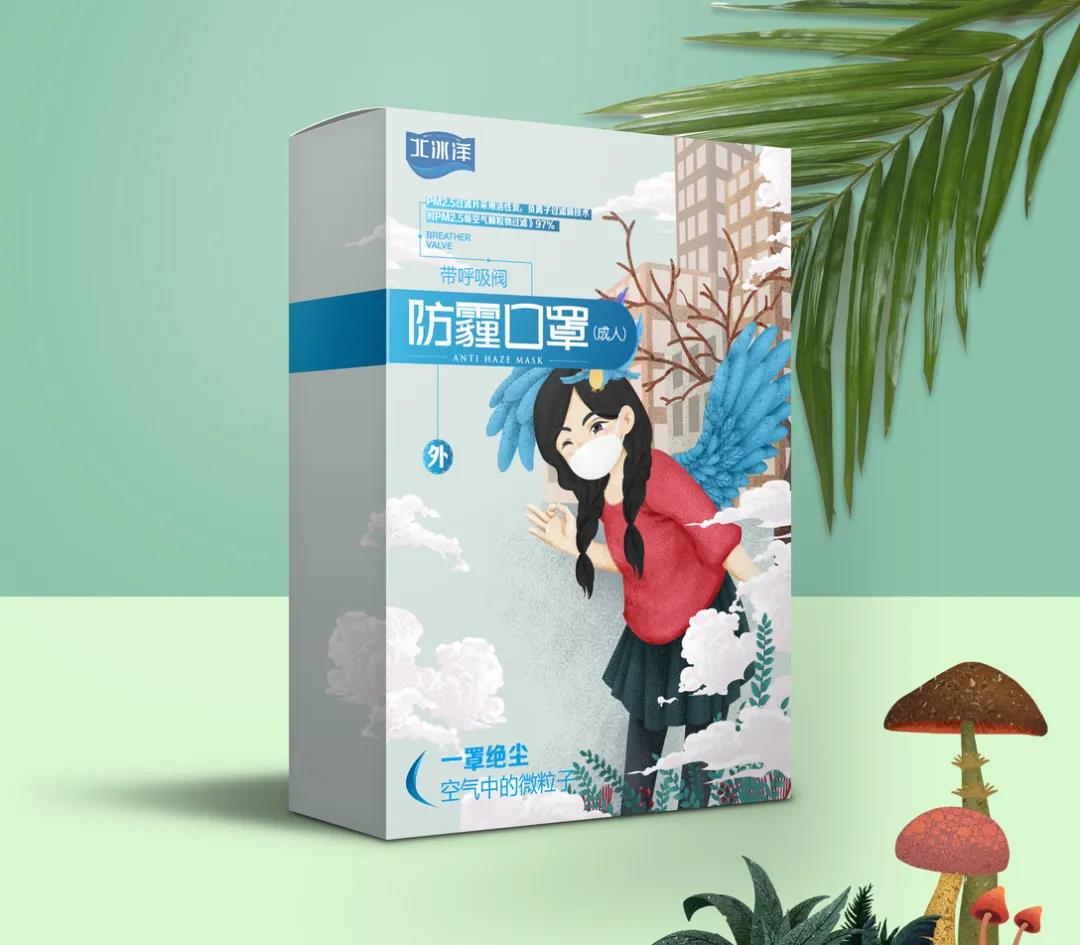 這款包裝乍一看以為只是簡單的IP形象,但在其身后加入了翅膀的插畫設計,通過擬物化手法進行創意描繪,在口罩設計上擁有自己的區分亮點。