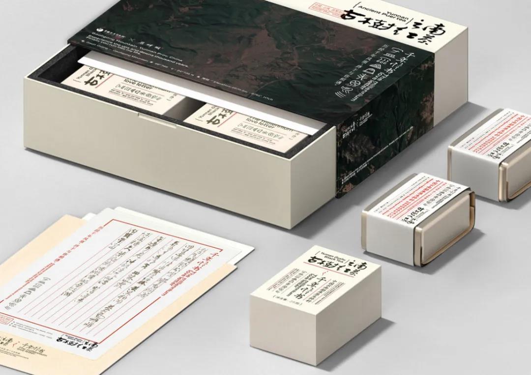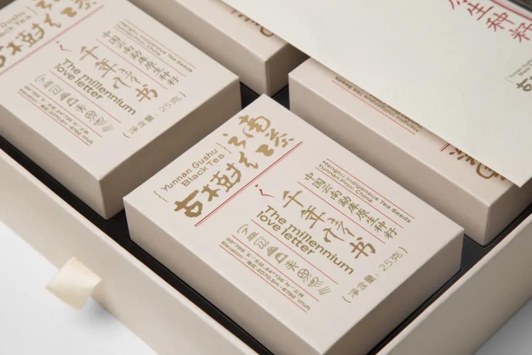 先來看有點浪漫的手工情書系列,原木色的禮盒包裝,奠定了整體歲月靜好般的小資情懷,輔以沉黑色的山景圖腹帶標(biāo)簽貼,很好地平衡了視覺層次。另外封面還設(shè)有古老的漢字書體,重點突出茶葉的產(chǎn)地等信息,呼應(yīng)了品牌的“手工情書”系列,增強整體的文化底蘊。
