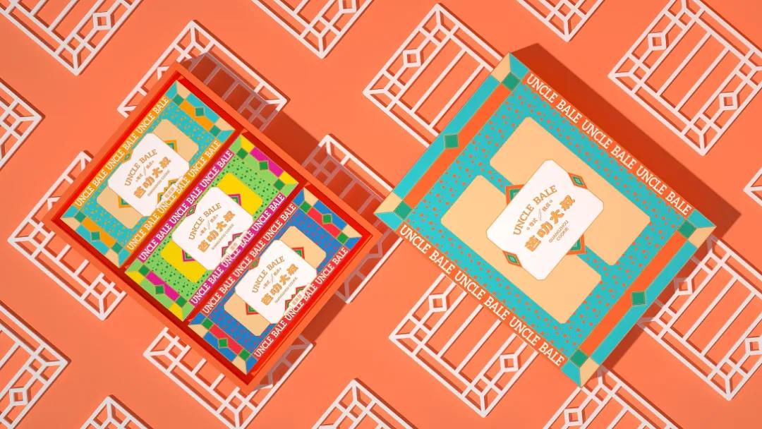 這款糕點采用高飽和度的暖色調設計,輔以封面中的幾何圖形撞色搭配,扁平化的形式勾勒了經典窗格的紋路元素,視覺上更具異域風情。居中排版的LOGO以徽標呈現,金色描邊搭配趣味的中英文字體設計,平衡整體視覺美感的同時,增強消費者對產品的好奇心理。