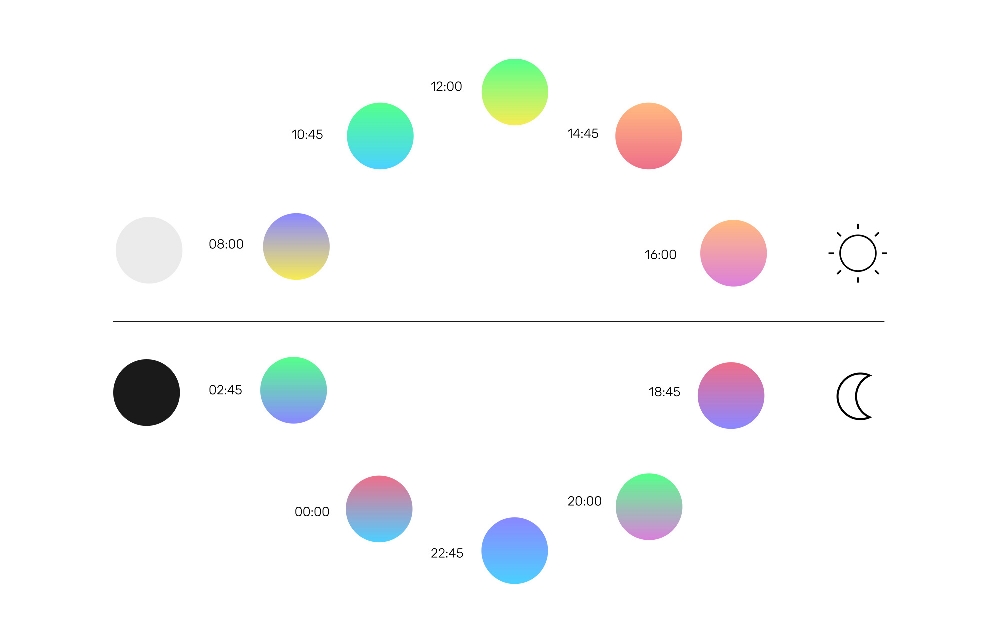 該設計機構希望通過一套帶有情感的圖形,來詮釋不斷變化的能量狀態。這些形狀通過強大的調色板得到呈現,這些調色板的靈感來自于全天不斷變化的光線顏色。